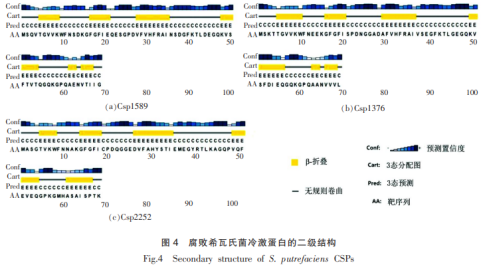 為更強(qiáng)掌握冷激蛋白質(zhì)潛在性的微生物作用,剖析其蛋白質(zhì)的空間布局。將海產(chǎn)品腐壞希瓦氏菌冷激蛋白質(zhì)的碳水化合物編碼序列遞交到PSIPRED預(yù)測(cè)分析其二級(jí)結(jié)構(gòu),結(jié)果見(jiàn)圖4。典型性的冷激蛋白質(zhì)的二級(jí)結(jié)構(gòu)包括五個(gè)β伸縮,預(yù)測(cè)分析獲得的二級(jí)結(jié)構(gòu)與這一結(jié)果大概相符合,Csp1589和Csp1376二級(jí)結(jié)構(gòu)的最后一個(gè)β伸縮發(fā)生斷塊,這可能是天冬酰胺預(yù)測(cè)分析真實(shí)度太低而致。