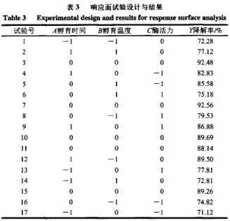 在單要素實驗基本上,挑選孵育時間(A)、孵育溫度(B)、酶魅力(C),以AFB1的溶解率(Y)為響應值,在其中-1、0、一分別意味著低、中、高3個水準,試驗設(shè)計與結(jié)果見表3。將數(shù)據(jù)信息效果開展多元線性回歸剖析,獲得線性回歸方程: