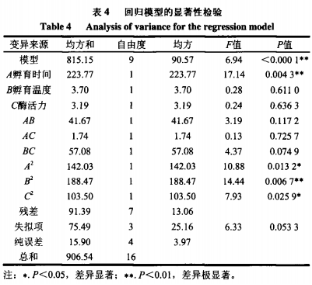 由表4得知,實體模型P值低于0.0001,說明該實體模型極明顯,失擬項P值超過0.05,說明失擬項認證不明顯,表明線性回歸方程靠譜能夠用以AFB1最大溶解率標準的預測分析。A和B對AFB1的溶解危害極明顯,A2和C2對AFB1的溶解危害顯薯,說明孵育時間、孵育溫度和酶魅力對AFB1的溶解有顯著性的危害,危害水平從大到小為孵育時間>孵育溫度>酶魅力。