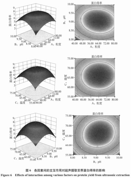 由方差分析得知,回歸分析極明顯(p<0.0001),獲取苦蕎麥蛋白質(zhì)方程式失擬項(xiàng)為0.5607>0.05;獲取黃酮類的失擬項(xiàng)為0.0894>0.05,二者都說明失擬項(xiàng)不明顯,且苦養(yǎng)蛋白質(zhì)的R2=0.9845,R2Adi=0.9646; 黃酮類的R2=0.9829,R2Adi=0.9610,說明該模式與真實(shí)值線性擬合性非常好,能夠運(yùn)用二者的線性回歸方程明確苦蕎麥蛋白質(zhì)和黃酮類化合物的較佳獲取加工工藝標(biāo)準(zhǔn)。依據(jù)回歸分析的方差分析也說明對苦養(yǎng)蛋白質(zhì)危害極明顯的要素有A(粒度分布)、A2、B2、C2,危害明顯的要素有B(pH)、C(溫度),AB、AC、BC的互動危害均不明顯。對苦養(yǎng)黃酮類化合物、多糖類化學(xué)物質(zhì)危害極明顯的是C(溫度)、A2、B2,危害明顯的有AB、AC的配對t檢驗(yàn),A(粒度分布)、B(pH)、BC、C2危害不明顯。從單要素水準(zhǔn)剖析能夠得到,每個要素對苦蕎麥蛋白質(zhì)危害的層次次序?yàn)榱6确植迹緋H>溫度,對苦養(yǎng)黃酮類危害的層次次序?yàn)闇囟龋玖6确植迹緋H。