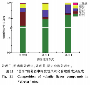 除此之外,不一樣解決組測得的揮發(fā)物口味化學(xué)物質(zhì)的構(gòu)成也是有顯著不一樣。表1和圖11表明了“美樂”紅酒中不一樣酶處理方法下關(guān)鍵揮發(fā)物香味成份(醇、脂類、酸和醛)的變化趨勢。