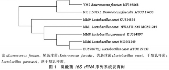 從培養(yǎng)液中任意選擇乳白色、網(wǎng)形的突起菌體,經(jīng)雙氧水酶和革蘭氏染色實(shí)驗(yàn)后,挑選出過氧化氫酶呈陰性、革蘭氏陽性菌轉(zhuǎn)錄組測序,經(jīng)同宗序列比對后,共評定出4株干酪乳桿菌和2株糞腸球菌。由圖1的系統(tǒng)發(fā)育進(jìn)化樹能夠看得出,共監(jiān)測到2個(gè)屬:腸球菌屬和乳酸桿菌屬。MMl(干酪乳桿菌)、MM6(干酪乳桿菌)、MM8(副干酪乳桿菌)、MM9(干酪乳桿菌)和YLl(屎腸球菌)、YM2(屎腸球菌)產(chǎn)生了2個(gè)種群并與相應(yīng)的方式菌種聚在一起,進(jìn)一步認(rèn)證了分子結(jié)構(gòu)學(xué)評定結(jié)論的穩(wěn)定性。