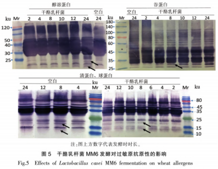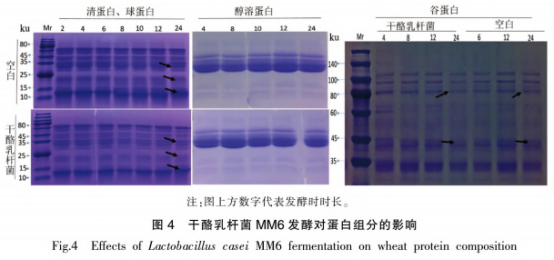 選用SDS-PAGE實(shí)驗(yàn)對發(fā)醇全過程中面糊蛋白質(zhì)的變動實(shí)現(xiàn)了評定。如圖所示4所顯示,在發(fā)醇24h后,清蛋白、血蛋白、醇溶蛋白質(zhì)、谷蛋白的成分和成分均有轉(zhuǎn)變 。伴隨著發(fā)醇的開展,清、血蛋白中25~35,15~25,10~15ku雜帶變淡:醇溶蛋白質(zhì)雜帶無顯著轉(zhuǎn)變:谷蛋白80ku和40ku上下的雜帶發(fā)醇后顯著變淡。12,15~25,40.88ku地區(qū)各自相應(yīng)著麥子過敏源Tria37.Tria18,Tria36和Tria26,從圖4能夠看得出,這種地區(qū)的蛋白質(zhì)在發(fā)醇24h后均有一定程度上的溶解。