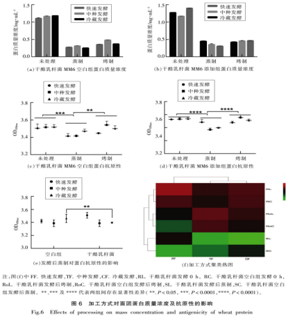 已經(jīng)有研究表明,生產(chǎn)加工方法對食材抗原性轉(zhuǎn)變有極強(qiáng)的危害,為進(jìn)一步研究干酪乳桿菌對麥子蛋白質(zhì)抗原性的危害,本實(shí)驗(yàn)中使用不一樣發(fā)醇方法制做面糊后煮制或烘烤,并抽樣測量蛋白量濃度及抗原性的轉(zhuǎn)變。由圖6a和6b得知,熱處理后蛋白質(zhì)成分減少。已經(jīng)有科學(xué)研究確認(rèn),熱處理可使蛋白產(chǎn)生溶解或集聚,造成含水量降低。由圖6c~e得知,沒經(jīng)熱處理時(shí),干酪乳桿菌加上組并沒有具有顯著地減少麥子蛋白質(zhì)抗原性的功效(與未加上組對比),可能是因?yàn)榘l(fā)醇做為一種遲緩地產(chǎn)生方法,管理體系中的胰蛋白酶、肽酶必須的時(shí)間和合適的自然環(huán)境充分發(fā)揮酶解功效溶解致敏物原蛋白質(zhì),而本研究室用的3種發(fā)醇方法時(shí)間均相應(yīng)較短,盡管冷藏發(fā)酵時(shí)間較長,可是4℃的超低溫并無法使酶充分運(yùn)用功效。經(jīng)厭氧發(fā)酵后烤制解決,一部分解決組抗原性略微提高。已經(jīng)有科學(xué)研究確認(rèn),蛋糕烘焙時(shí)美拉德反應(yīng)物質(zhì)很有可能會(huì)提高麥子蛋白質(zhì)的過敏源性。如圖所示6e所顯示,經(jīng)冷藏發(fā)酵后煮制,干酪乳桿菌加上組的抗原性顯著降低(與未加上組對比),可能是因?yàn)榘l(fā)醇溶解了一部分難溶過敏源,經(jīng)煮制后,水溶小分子水蛋白質(zhì)產(chǎn)生集聚,遮蓋了抗原體線性表位進(jìn)而進(jìn)一步減少了混和發(fā)酵面團(tuán)的抗原性。如圖所示6f所顯示,色調(diào)由紅到綠意味著抗原性慢慢減少。僅發(fā)醇、發(fā)醇后煮制、發(fā)醇后烤制各自聚大了3類,殊不知干酪乳桿菌加上組)與干酪乳桿菌空缺組并沒有聚大2類,迅速發(fā)醇、中種發(fā)醇和冷藏發(fā)酵聚大了2類,表明干酪乳桿菌做為發(fā)醇種時(shí)生產(chǎn)加工方法對麥子蛋白質(zhì)抗原性的危害超過干酪乳桿菌發(fā)醇。中種發(fā)醇和冷藏發(fā)酵中間無明顯差別可是差異于迅速發(fā)醇。除此之外,煮制坐落于生產(chǎn)加工聚類算法圖的最下邊,與圖6c和6d一致。不論是干酪乳桿菌空缺組或是加上組,煮制都不同于發(fā)醇和烘烤,具備能夠更好地減少面糊抗原性的工作能力。在全部解決中,具備明顯優(yōu)點(diǎn)的是干酪乳桿菌加上組冷凍/中種發(fā)醇后煮制。