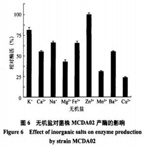 碳酸鹽對菌種MCDA02生長發(fā)育的危害如圖所示6,選定的9種不一樣的碳酸鹽中,加上ZnSO4時該菌種產(chǎn)酶最大,隨后是KH2PO4,其相對性酶活達75%之上,加上CuSO4時相對性酶活最少,不夠25%。因而最后采用ZnSO4為配置發(fā)醇培養(yǎng)液常用碳酸鹽。
