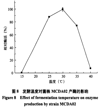 發(fā)酵溫度對菌種MCDA02生長發(fā)育的危害如圖所示8,在30℃時菌種MCDA02產(chǎn)幾丁質(zhì)脫乙酰酶的量最大。溫度高于30℃時,菌種的產(chǎn)酶量快速降低,溫度抵達40℃時,菌種MCDA02的相對性酶活低至10%上下。