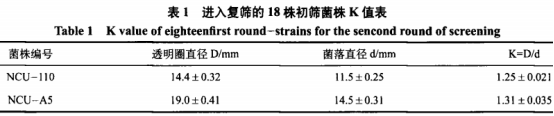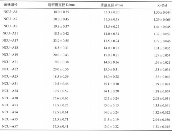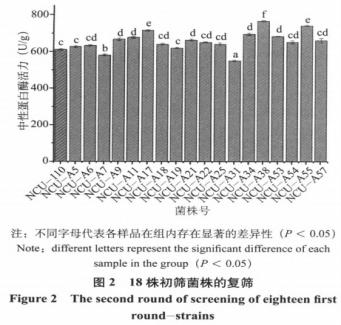 點(diǎn)種取決于調(diào)查優(yōu)質(zhì)菌種是不是能在集中的培育中仍能保持較高的中性蛋白酶魅力,而且規(guī)定菌種的發(fā)育速度快,對(duì)自然環(huán)境適應(yīng)能力強(qiáng)。菌種正基因突變主要表現(xiàn)為菌體漲勢(shì)好而且K值比對(duì)比值大。由表1得知,18株初篩菌種的K值均超過初始菌種,其產(chǎn)中性蛋白酶工作能力很有可能好于初始菌種,在其中菌種NCU—A38、NCU—A55、NCU—A17菌體漲勢(shì)不錯(cuò),且全透明圈直徑較大,各自為25.6、23.5、23.5mm,而他們的K值則各自實(shí)現(xiàn)了2.08、2.04、1.77。袁艷玲研究表明,根據(jù)K值挑選正基因突變株高效率,但菌種的產(chǎn)中性蛋白酶工作能力與K值并并不是呈規(guī)律性的線性相關(guān)。因此必須進(jìn)一步的復(fù)篩來明確最后增產(chǎn)中性蛋白酶活的基因突變株,試驗(yàn)選用淺盤酒曲制作測(cè)量中性蛋白酶活給予認(rèn)證。