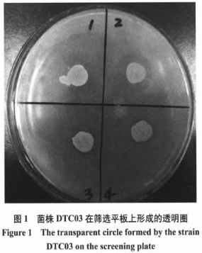 將聚集塑造的泥樣梯度方向稀釋液后,施膠于加上柚皮苷的挑選培養(yǎng)液,30℃顛倒塑造,每日觀查冒出的菌體形狀及全透明圈發(fā)生狀況。挑菌初篩發(fā)生全透明圈的菌體,分離純化后挑菌單菌體點樣至挑選平板電腦。挑選平板電腦分四塊地區(qū)點樣后放進30℃恒溫箱顛倒塑造,7d后得到1株有顯著全透明圈菌種,如圖所示1。將該菌種取名為DTC03。