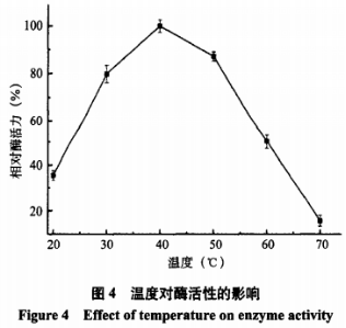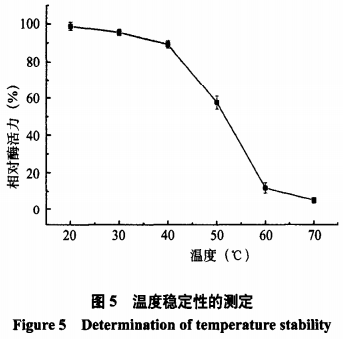 如圖4所顯示,菌種DTC03產(chǎn)α-L-鼠李甘酶在20~40℃氣溫下,伴隨著氣溫升高,相對(duì)性酶魅力呈持續(xù)上升發(fā)展趨勢(shì)。40~70℃下,相對(duì)性酶魅力伴隨著氣溫的升高呈下降趨勢(shì),且溫度處在50~70℃時(shí),隨環(huán)境溫度的上升,酶魅力快速降低。溫度在40℃時(shí)相對(duì)性酶魅力最大。同一種酶來源于不一樣,自然環(huán)境不一,其酶學(xué)特性也有一定的差別?,F(xiàn)階段研究表明,α-L-鼠李甘酶的適宜溫度多在40℃至65℃中間。