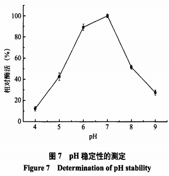 菌種DTC03產(chǎn)α-L-鼠李甘酶的適宜pH結(jié)果見圖6。當(dāng)緩沖溶液pH為4.0時(shí),相對(duì)性酶魅力小于20%。當(dāng)緩沖溶液pH從4.0提升到7.0時(shí),相對(duì)性酶魅力呈持續(xù)上升發(fā)展趨勢(shì)。當(dāng)緩沖溶液pH從7.0提升到9.0時(shí),相對(duì)性酶魅力呈下降趨勢(shì)。當(dāng)pH為7.0時(shí),相對(duì)性酶活最大。現(xiàn)階段報(bào)導(dǎo)的微生物菌種a-L-鼠李甘酶適宜pH在4.0~7.0中間。