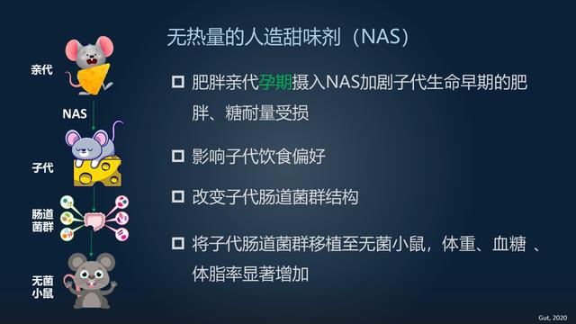 除此之外,人工合成的甜味素還能夠危害后代的腸菌。將這種腸菌移殖到無菌檢測的小白鼠身體還可以提升無菌檢測小白鼠的休重、血糖值或是是血糖。