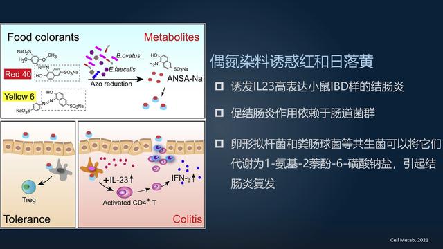 除此之外,食品類之中還大量的出現(xiàn)著各種各樣黑色素,在其中最普遍的便是誘惑紅和日落黃。這兩個常用的黑色素能夠引起白介素-23 高表述小白鼠造成大便出血、拉肚子那樣的一個類似 IBD 的病癥。