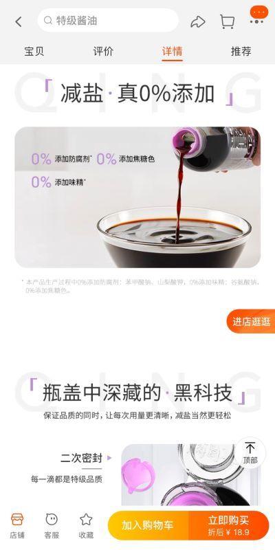 值得一提的是,新聞記者整理還發(fā)覺,六月鮮輕系列產品生抽在市場銷售宣傳策劃中都突顯“0%加上”標識。在六月鮮天貓店中,該商品詳細介紹一樣標明“減鹽0%加上”,即0%加上添加劑、0%加上雞精、0%加上檸檬黃。更生動的是,在“賣貨一姐”薇婭2021年1月27日的直播推薦中,為了更好地將六月鮮輕系列產品生抽描述為0%加上,薇婭在閱讀文章原材料時乃至挑選對5’-肌苷酸二鈉置若罔聞,挑選繞過不讀。