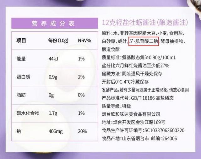 殊不知該產品系列成分表卻相去甚遠,據(jù)12g輕鹽杜蠣生抽/輕鹽昆布生抽原材料表所顯示,在其中除開生抽生產制造務必采用的水、非轉基因油脫油黃豆、麥子、食鹽等,第六位豁然標明著5\’-肌苷酸二鈉。據(jù)了解,5\’-肌苷酸二鈉是一種食用添加劑,為透明至乳白色晶體或乳白色晶體粉末狀,具備特異性味,加上5’-肌苷酸二鈉的食物有肉質地類的鮮香,這代表著六月鮮輕系列產品并不是“真真正正0%加上”。