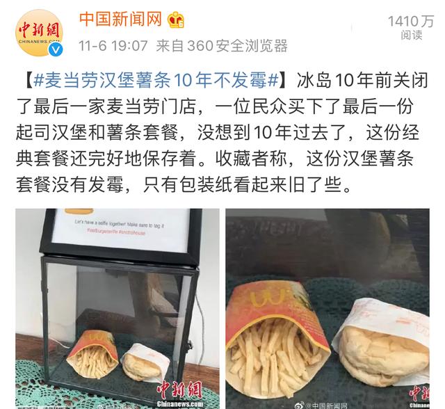 “冰島十年前關(guān)掉了最終一家肯德基店,一位住戶買(mǎi)下來(lái)了最終一份漢堡包和炸薯?xiàng)l,結(jié)果十年過(guò)去,這一份漢堡包和炸薯?xiàng)l還完好無(wú)損地保留著。根據(jù)外型,我們可以見(jiàn)到,這一份漢堡包和炸薯?xiàng)l并沒(méi)有長(zhǎng)霉霉變,僅僅包裝舊了一些罷了?!?/p>