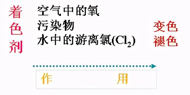 漂白劑。以原花青素(鮮紅色)退色實際效果最好是,胡羅卜素(淡黃色)其次、葉綠素(翠綠色)最爛。