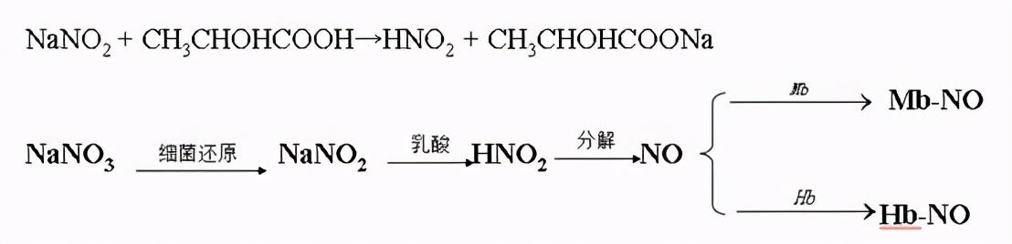 添加的NO2-與肉類食品中乳酸菌功效轉化成HNO2,常溫狀態(tài)不穩(wěn)定的HNO2溶解出NO(一氧化氮),NO與Mb和Hb反映,各自轉化成MbNO(亞硝基肌鈣蛋白)和HbNO(亞硝基血紅蛋白濃度),這2種化學物質很平穩(wěn),不容易褐變。
