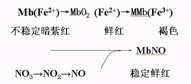 MbNO受熱后釋放巰基(-SH),轉化成較平穩(wěn)的具備紅色的亞硝基鮮血原。