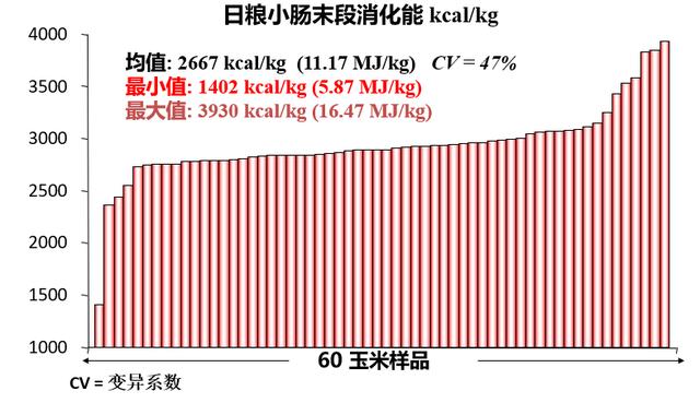 除開(kāi)不一樣原材料自身的構(gòu)成差別外,同一種原材料不一樣批號(hào)、不一樣原產(chǎn)地、不一樣時(shí)節(jié),其營(yíng)養(yǎng)成分水準(zhǔn)和構(gòu)成也各有不同。以苞米為例子,不一樣時(shí)間段的苞米粗蛋白成分也不同樣,整體而言上半年度獲得的苞米粗蛋白成分高過(guò)后半年(表2)。不僅僅是苞米存有基因變異,別的原材料也具有相似的狀況,例如麥子麥麩中碳水化合物成分的構(gòu)成等(表3)。這類差別有可能會(huì)致使在生物身體營(yíng)養(yǎng)物質(zhì)釋放出來(lái)的不一樣,以苞米為例子,其在肉食雞結(jié)腸尾端消化吸收能呈現(xiàn)出很大的基因變異,較大和最少消化吸收會(huì)差2528 kcal/kg,CV值做到47%(圖1)。而一切正常在非特殊情況下(應(yīng)激反應(yīng)、病癥感柒、免疫刺激等),其小動(dòng)物的主要營(yíng)養(yǎng)成分需要是一致的。針對(duì)秘方師而言,怎樣降低批號(hào)間差別造成 的小動(dòng)物特性差別也是一大挑戰(zhàn)。怎樣尋找一個(gè)“熨斗”,來(lái)“燙平”精飼料批號(hào)間的不一樣,保證精飼料品質(zhì)的平穩(wěn),進(jìn)而確保動(dòng)物生產(chǎn)特性和身心健康十分重要了。