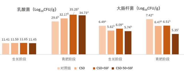 在這個(gè)實(shí)驗(yàn)中對(duì)腸道微生物兩棲綱開(kāi)展了統(tǒng)計(jì)分析,結(jié)果看到在特威寶SSF應(yīng)用的情形下,腸胃內(nèi)乳酸菌飲料總數(shù)明顯提升而大腸埃希菌總數(shù)明顯降低。這也說(shuō)明特威寶SSF對(duì)腸道微生物兩棲綱管控層面也激發(fā)了至關(guān)重要的功效(圖4)。