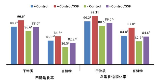 結(jié)果看到在基本日糧上加上特威寶SSF能各自提升回腸和總消化系統(tǒng)干物質(zhì)吸收率2.65%和2.06%,有機(jī)化合物的吸收率各自提升1.89%和3.42%。而調(diào)節(jié)秘方后的解決組根據(jù)應(yīng)用SSF,回腸和總消化系統(tǒng)干物質(zhì)吸收率各自提升1.58%和1.23%,有機(jī)化合物的吸收率各自提升2.07%和2.25%(圖3)。整體而言,無(wú)論是在基本日糧或是秘方更改后的日糧中應(yīng)用特威寶SSF都能夠提升生物的吸收使用率,改進(jìn)精飼料應(yīng)用狀況,此外秘方更改后的日糧相互配合特威寶SSF的運(yùn)用能做到基本日糧的實(shí)際效果,說(shuō)明酶制劑的運(yùn)用能夠附加釋放出來(lái)精飼料中的動(dòng)能、鈣等營(yíng)養(yǎng)物質(zhì)。