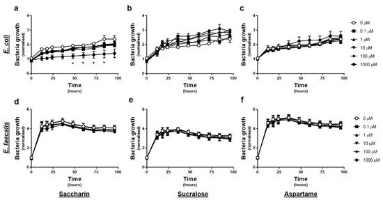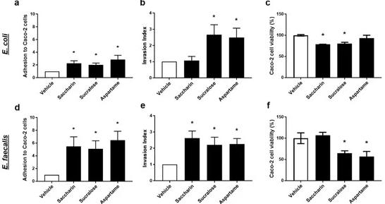 除此之外,全部三種甜味素都造成 高致病腸道細菌侵入在腸腔中看到的Caco-2體細胞,但人造糖以外,它對大腸埃希菌的侵入沒有顯著危害。