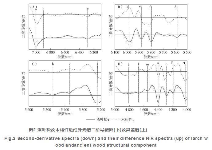 在譜帶范疇4000~5000cm-1內(nèi)(圖2D),二階導(dǎo)數(shù)譜圖發(fā)生7個吸收譜帶,各自坐落于4808,4675,4546,4404,4289,4195和4019cm-1處。在其中,k、n、o和q屬于甲基纖維素結(jié)晶體區(qū)或半結(jié)晶體區(qū),其差譜均為負(fù)數(shù),說明木結(jié)構(gòu)建筑中纖維和木質(zhì)素成分降低,而屬于木質(zhì)纖維素的l和m處,其差譜值則為恰逢,說明木質(zhì)纖維素的相應(yīng)成分有所增加。在譜帶4675cm-1處,目前參考文獻(xiàn)末見其所屬。因為在譜帶范疇4000~5000cm-1內(nèi),主要是CH官能團(tuán)的升縮震動及形變震動為主導(dǎo),因而,融合有機(jī)化學(xué)成分定性分析的結(jié)果,推論該譜帶屬于木質(zhì)纖維素,臨時把該譜帶屬于CH官能團(tuán)的升縮震動與形變震動的合頻。