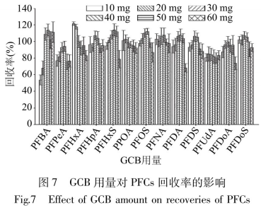 根據(jù)在空缺試品中加上總體目標物,做2μg/kg加上濃度值3個平行面,調(diào)查不一樣GCB使用量與80mgC18、100mgPSA組成對13種PFCs加標回收率的危害,結(jié)果如圖所示7所顯示。伴隨著GCB使用量提升,同成品率最高值基本上維持不會改變,在110.2%~121.6%之問;極小值轉(zhuǎn)變比較大,為53.6%~84.3%。GCB用景為30、40、50mg時,利用率為75.6%~114.0%,均在有效范疇內(nèi);在其中30mg的利用率在84.3%~110.2%中間,不一樣PFCs的同成品率變化幅度并不大。由于以上3個加上量都能夠有效的除去黑色素、試品水溶液貼近透明的條件下,充分考慮提升GCB吸收劑使用量將會會產(chǎn)生試驗成本上升及殘渣引進,最終明確30mg是最優(yōu)的GCB加上量。
