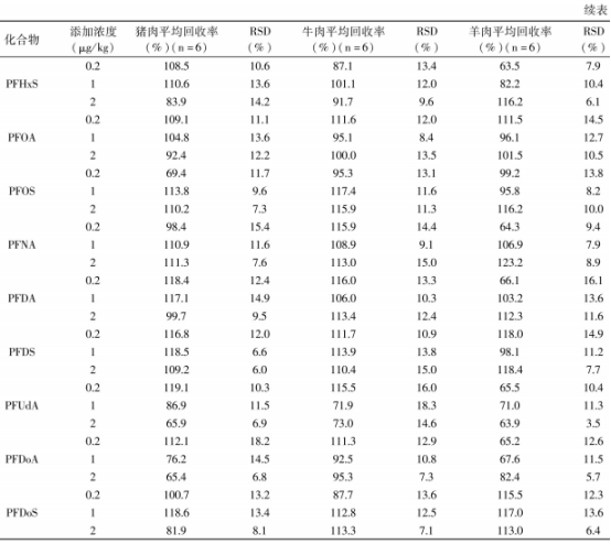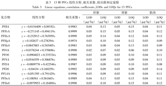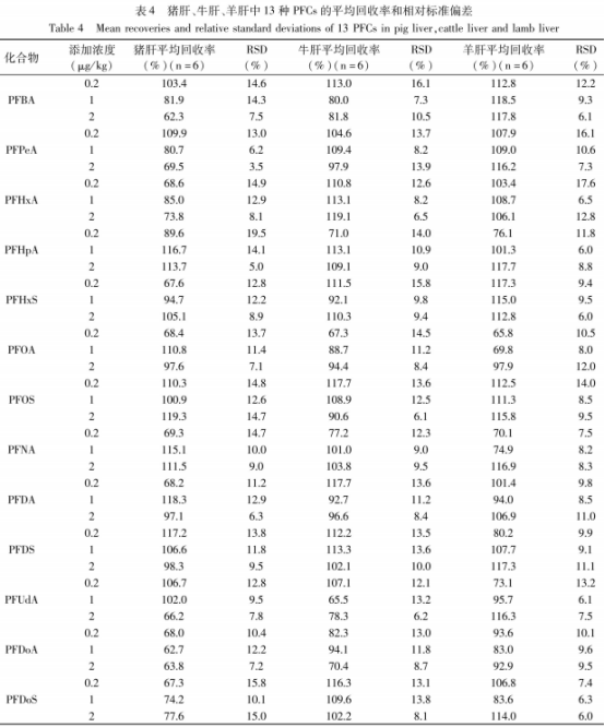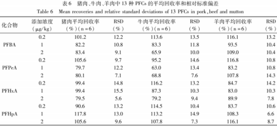 試驗結(jié)果顯示,13種PFCs在0.05~10ng/mL濃度值范疇內(nèi)線性相關(guān)優(yōu)良,相關(guān)系數(shù)r為0.9974~0.9999,均超過0.99。在空缺試品中加上預(yù)計最少可接納濃度值0.15μg/kg,每一個試品平行測定10次,各自測算3倍相對標準偏差、10倍相對標準偏差,明確本方式LOD和LOQ各自為0.02~0.05、0.06~0.15μg/kg。實際見表3。