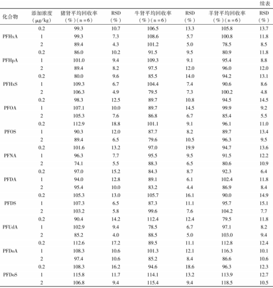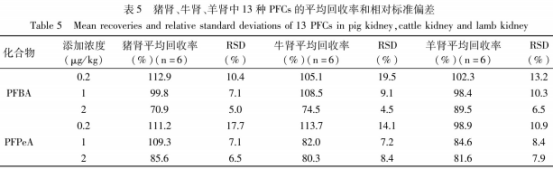 13種PFCs在0.2、1、2μg/kg三個加上水準的均值利用率為62.3%~119.3%,相對性相對標準偏差(RSD)各自為6.4%~19.9%、5.7%~18.3%、3.5%~15.0%(見表4~表6)。本方式有著較高的同成品率和精度,達到GB/T27417-2017中多殘余剖析規(guī)定。