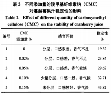 選擇羧甲基甲基纖維素鈉(CMC)做為增稠劑,配置含量為30%的曼越莓水果汁,靜放一段時(shí)間后觀查其外型,品味水果汁,并開展離心式實(shí)際操作,測算其可靠性,獲得不一樣加上量的羧甲基甲基纖維素鈉(CMC)對曼越莓水果汁可靠性的危害,結(jié)果如表2所顯示。