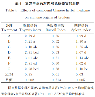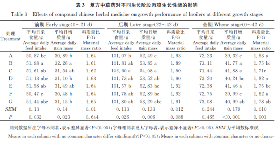 由表3由此可見,實(shí)驗(yàn)早期(0~21d),B組肉食雞均值日吃料量明顯高過A組和F組(P<0.05),且其均值日增品質(zhì)明顯高過除C組和E組外的別的每組(P<0.05)。實(shí)驗(yàn)中后期(22~42d),C組肉食雞均值日吃料量和平均日增品質(zhì)均明顯高過A組和E組(P<0.05),B組肉食雞均值日增品質(zhì)明顯高過A組、E組和F組(P<0.05)。從全期(0~42d)看,各解決組肉食雞均值日吃料量無顯著性差異(P>0.05),但B組肉食雞均值日增品質(zhì)明顯高過A組、d組和F組(P<0.05),且C組、E組、G組肉食雞均值日增品質(zhì)明顯高過A組(P<0.05),而A組肉食雞料質(zhì)量比明顯高過B組、C組和E組(P<0.05),B組肉食雞料質(zhì)量比明顯小于d組和F組(P<0.05)。