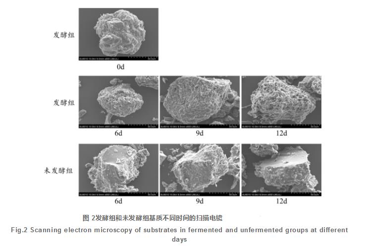 圖2為發(fā)醇組和未發(fā)醇組到不一樣日數(shù)時菌質(zhì)的表觀形狀圖。由圖2得知,在發(fā)醇組,伴隨著灰樹花發(fā)酵時間的增加,栽培基質(zhì)構(gòu)造造成很多微小的孔隙度,在發(fā)醇終點站時,栽培基質(zhì)從外到內(nèi)均發(fā)生了很大的孔隙度,構(gòu)造幾近溶散,對比于發(fā)醇組,未發(fā)醇組栽培基質(zhì)在0~12d的表觀構(gòu)造形狀均未出現(xiàn)突出的轉(zhuǎn)變,構(gòu)造均比較詳細高密度。