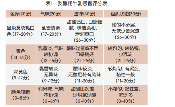 機(jī)構(gòu)10人點(diǎn)評(píng)工作組,從顏色、味道、味道及結(jié)構(gòu)情況四個(gè)層面對(duì)發(fā)酵乳開展評(píng)分,評(píng)定標(biāo)準(zhǔn)如表1所顯示。