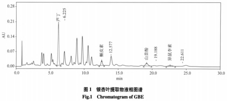 提升后的色譜儀標準下銀杏樹葉提取液的高效液相圖普如圖所示1所顯示。