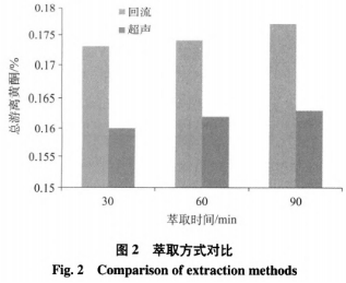稱量5g原材料,添加100mL工業(yè)甲醇,選用超聲波提純和加溫流回提純,較為超聲波和流回二種方法提純實際效果,結(jié)果如圖所示2所顯示。由圖2得知,在提純時間各自為30min、60min、90min時,加溫流回提純銀杏樹葉總分散黃酮類成分均高過超聲波流回方法,故銀杏樹葉提純方法選為加溫流回。
