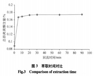 由圖3得知,流回提純30min時分散黃酮類的結(jié)果已保持穩(wěn)定,增加提純時間檢驗結(jié)果無顯著轉(zhuǎn)變,故提純時間當選30min。