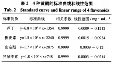 對混和標液做2倍梯度方向濃度值稀釋液,所得的蘆丁、原兒茶醛、山柰酚、異鼠李素線性方程、相關(guān)系數(shù)r、線性方程見表2。
