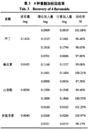 對(duì)已經(jīng)知道蘆丁、原兒茶醛、三奈酚、異鼠李素4種分散黃酮類成分的提取液中添加一定量的標(biāo)準(zhǔn)物質(zhì)水溶液,加標(biāo)回收率如表3所顯示。由表3得知,4種黃酮類的加標(biāo)回收率均在95%~106%中間,該方式定量分析精確。