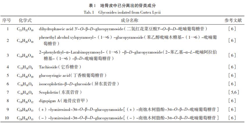 地骨皮水提物及醇提物中剝離獲得了苷類物質(zhì)。運用醇有機溶劑開展剝離的效果較高,分離出來出的化學(xué)物質(zhì)類型較多,實際地骨皮中已分離出來出的苷類成份見表1。