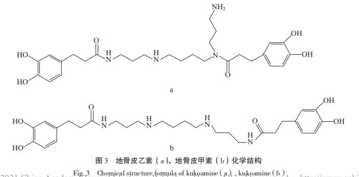 地骨皮中帶有4個環(huán)八肽化學(xué)物質(zhì),各自為枸杞子素A、B、C、D。李晟鶴等從地骨皮中拇指認出來環(huán)肽類成份3個及5個別的成份。除此之外,地骨皮中還帶有丙烯胺成份,包含kukoamines酚氟苯和其他類型酚氟苯等,在其中2、13、14號成份有著明顯的抗感染活力。主要成分和成份化學(xué)結(jié)構(gòu)式見表2及圖3。