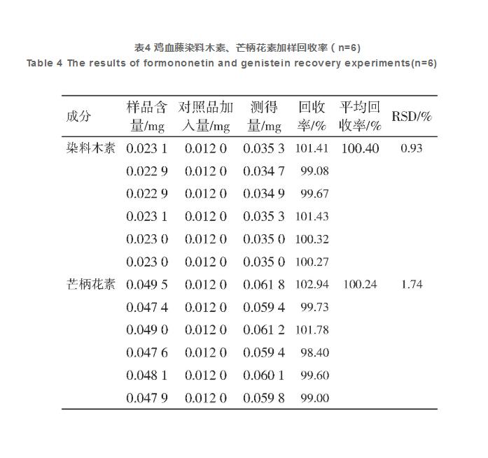 取己知成分的試品粉末狀6份,每一份0.5 g,高精密稱取,各自添加染料木素、芒柄花素的標(biāo)準(zhǔn)品0.012 mg,按“2.3.3”項(xiàng)下方式制取供試品水溶液開展測量。結(jié)果詳細(xì)表4。