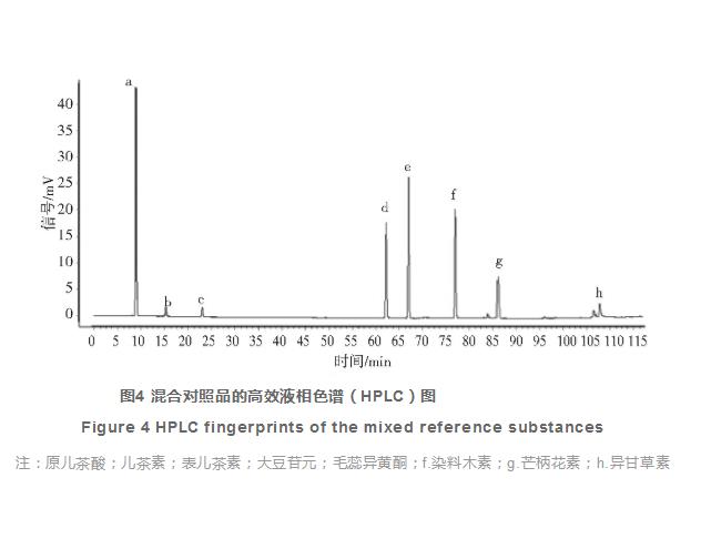 高精密稱量標(biāo)準(zhǔn)品原兒茶酸2.99 mg,芒柄花素2.10 mg,黃豆苷元2.25 mg,兒茶酸2.24 mg,染料木素2.46 mg,毛蕊大豆異黃酮2.68 mg,表兒茶素2.37 mg,異甘草素1.09 mg,各自用工業(yè)甲醇滴定劑于5 m L量瓶中,混勻,做為儲備液。各自取原兒茶酸、芒柄花素、黃豆苷元、兒茶酸、染料木素、毛蕊大豆異黃酮、表兒茶素及異甘草素標(biāo)準(zhǔn)品儲備液0.5 m L置10 m L量瓶中混和,用工業(yè)甲醇滴定劑,混勻,做為混和標(biāo)準(zhǔn)品水溶液。標(biāo)準(zhǔn)品色譜見圖4。