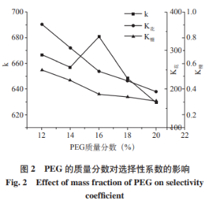 由圖2得知,伴隨著PEG質(zhì)量濃度的提升,原花青素與糖原殘渣的擴散系數(shù)都呈下滑的發(fā)展趨勢,原花青素的減少力度更高一些,可選擇性指數(shù)k存有先降低后升高再降低的發(fā)展趨勢,在PEG質(zhì)量濃度為16%做到最大。