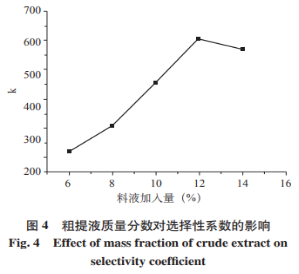 如圖4得知,伴隨著料液添加量的增加,可選擇性指數(shù)展現(xiàn)先上升后降低的發(fā)展趨勢,在料液添加量為12%時,可選擇性指數(shù)做到最大。當(dāng)料液添加量超出12%時,下非常中原花青素的成分逐漸升高,造成 K花逐漸降低,可選擇性指數(shù)k逐漸出現(xiàn)下降趨勢。