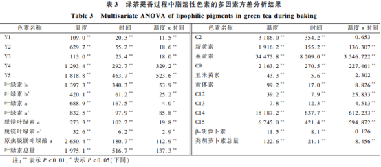 選用多要素方差分析研究出香味溫度、出香味時間以及配對t檢驗對出香味中在產(chǎn)品脂溶性黑色素成分的危害,結(jié)果見表3。由表3得知,出香味溫度和時間對所解析的15種黑色素成分均有極明顯危害(P<0.01)。出香味溫度和時間段的配對t檢驗除對C2、玉米黃素及β-胡羅卜素的成分無明顯危害外,對其他黑色素成分的危害均做到明顯或極明顯水準。從F值看來,出香味溫度對各黑色素成分的危害水平均超過出香味時間、出香味溫度和時間配對t檢驗的危害水平。