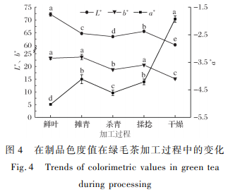 干茶飽和度值在綠霉茶生產(chǎn)過程中的轉(zhuǎn)變 如圖所示4所顯示。L∗意味著色度,在茶青生產(chǎn)過程中L∗呈下降趨勢,在其中攤青和干躁處置后L∗明顯減少,在產(chǎn)品顏色顯著發(fā)暗。攤青后在產(chǎn)品色度略微提升,很有可能與在產(chǎn)品的水份再次遍布及含有化學物質(zhì)透過至表層相關(guān)。a∗意味著綠紅度,恰逢意味著色調(diào)偏紅,負數(shù)意味著色調(diào)偏綠。在茶青生產(chǎn)加工中a∗維持負數(shù),且展現(xiàn)增長的趨勢,說明在產(chǎn)品顏色以環(huán)保為主導,但翠綠色顏色慢慢消弱,干躁后a∗變化幅度較大。b∗意味著黃藍度,恰逢意味著色調(diào)偏暗,負數(shù)意味著色調(diào)偏灰。在茶青生產(chǎn)加工中b∗的變化趨勢與L∗的比較一致,在產(chǎn)品主要表現(xiàn)為黃度減少。