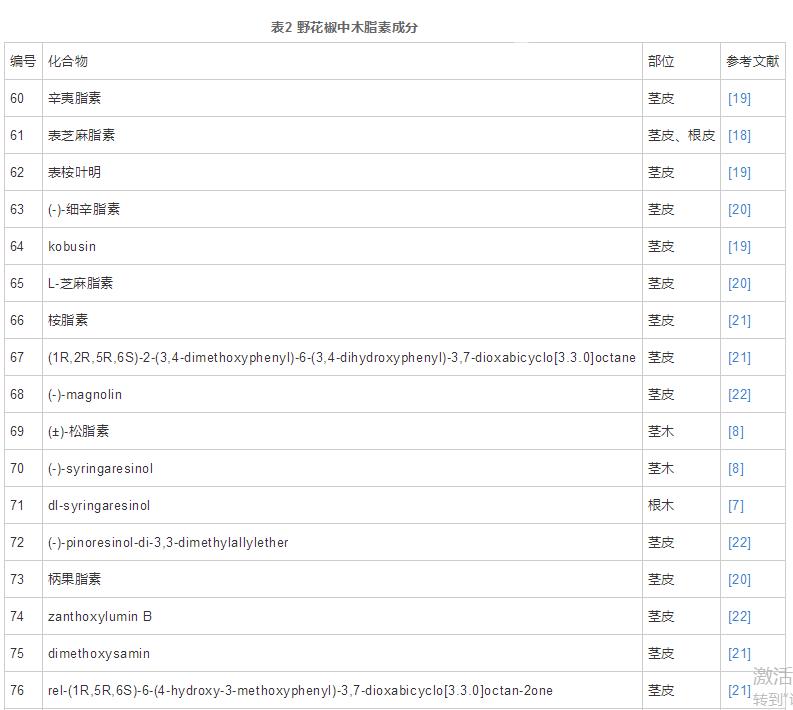 木脂素類成份已報(bào)導(dǎo)34個,其關(guān)鍵結(jié)構(gòu)特征包含四氫呋喃類木脂素(60~79)和木脂素二聚體(80~88),別的也有苯并呋喃類木脂素(3)和簡易木質(zhì)纖維素(4)。見表2、圖2。