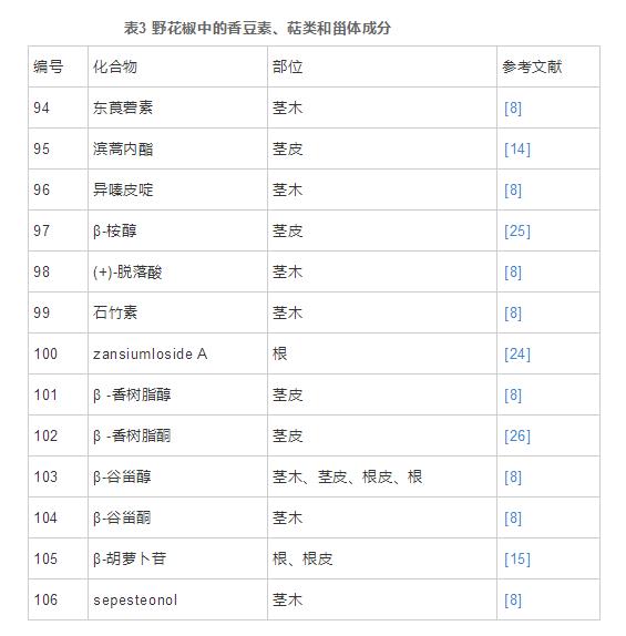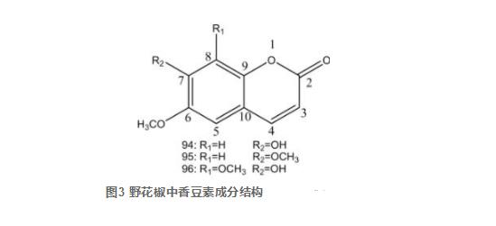香豆素類是一類具備苯駢-吡喃酮母核的自然物質(zhì)的統(tǒng)稱,野花椒中消息了3個香豆素類物質(zhì)(94~96),結(jié)構(gòu)特征均為簡易香豆素類,即在苯環(huán)一側(cè)有替代,且7位甲基未與6(或8)位官能團(tuán)產(chǎn)生咪唑環(huán)或吡喃環(huán)的香豆素類。見表3、圖3。