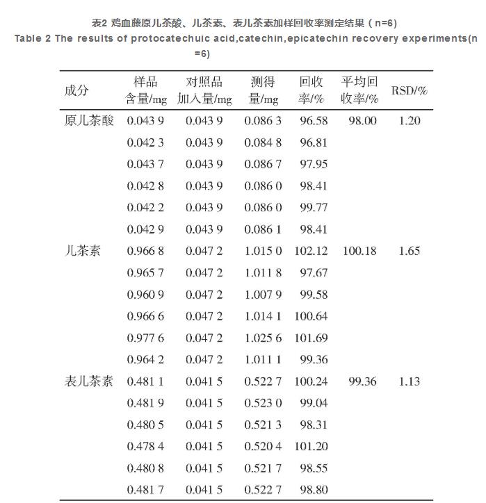 取己知成分的試品粉末狀6份,每一份1.0 g,高精密稱取,各自高精密添加原兒茶酸、兒茶酸、表兒茶素標(biāo)準(zhǔn)品,按“2.2.3”項(xiàng)下方式制取供試品水溶液并測量,測算加樣利用率。結(jié)果見表2。